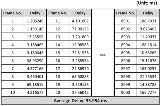 Figure 23 presents a table that records the time required to process individual frames during the virtual driving simulation. Each entry in the table represents the total time required for a frame to complete the processing sequence, from the initial capture to the output. On average, each frame requires approximately 33.954 ms to process, indicating that the proposed system generally maintains low-latency performance within the 50 ms target threshold.