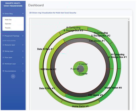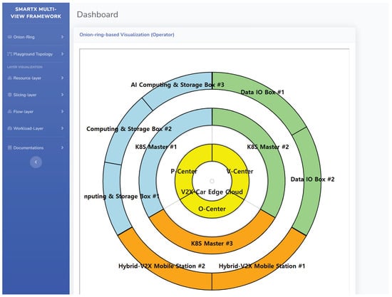 In the displayed scenario, the onion-ring visualization highlights the flow of network traffic during a relatively balanced state, with no significant congestion or bottlenecks observed. Each concentric ring represents a specific layer in the network, with inner rings corresponding to high-priority traffic and outer rings indicating auxiliary or low-priority flows. Although the figure demonstrates a calm state of network activity, it also showcases the ability of the visualization tool to track and map interactions across multiple nodes in real time. This tool is particularly useful for identifying potential anomalies, optimizing data flow, and ensuring that the proposed system operates efficiently under various traffic conditions. Visualization is integral to maintaining system performance, providing a proactive method for managing and balancing network resources. By offering an intuitive and dynamic representation of the operational state of the network, onion-ring visualization enhances situational awareness and supports real-time decision making within the proposed V2X-Car Edge Cloud framework.