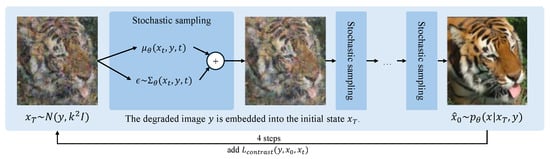 denotes the Euclidean distance between two samples; P denotes the feature dimension of the sample; is the weight of the comparison with HR image and LR image, respectively, under the diffusion step already taken; m is the LR comparison threshold; and N is the number of samples. Specifically, controls the regularization strength to prevent overfitting, while m determines the degree of smoothness in the image processing pipeline. Of course, the optimization of the model weights is still mainly determined by the form of diffusion in ResShift, which usually needs to minimize its negative variational lower bound, i.e.,: