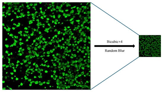 As in Figure 3, we downsampled the high-resolution images in the dataset using bicubic interpolation and add random Gaussian blur, where the parameter of downsampling is four times, and the blur parameter interval is taken as [0.45, 2], in which the two values represent the minimum and maximum values of the blur interval, respectively. To facilitate visual comparison and training, we uniformly crop the high-resolution images of the validation set and the test set to 512 × 512 pixels, and, correspondingly, the LR of the low-resolution images is 128 × 128 pixels. Metrics such as PSNR, LPIPS, and NIQE are based on the comparison of high-resolution image (HR) and Ground Truth (GT).