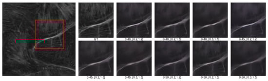 For the hyperparameters, “degradation_type” is set to “real-esrgan” degradation channel, which consists of two identical degradation steps containing the same fuzzy kernel with multiple random noise range values. The “crop_pad_size” is set to 300 (pixels), which indicates that the oversized images in the training set are cropped into small images of less than 300 × 300 pixels to improve the overall learning efficiency and training speed of the model. In addition, “iterations”, “microbatch”, “epoch”, “warmup_iterations”, “milestones”, and “save_freq” are set to 1000, 2, 200, 5000, [68,000, 90,000], and 10,000, respectively. Moreover, we crop the high-resolution images of the validation and test sets into small images of 512 × 512 pixels, which is convenient for quick validation, testing, and subsequent comparison.