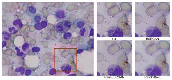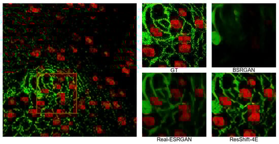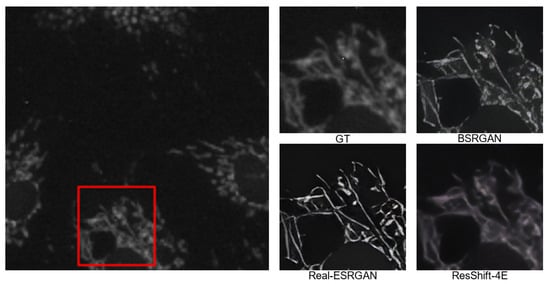 Blind super-resolution models based on diffusion models often provide better visualization results. In order to further verify the application advantages of the ResShift-4E model, we choose the GAN-based blind super-resolution models such as BSRGAN [40] and Real-ESRGAN [41]. ResShift-4E is superior to the compared methods on three main types of microscopy images, and the comparison results are shown in Figure 6, Figure 7 and Figure 8. In which, the images labeled “GT” are the cropped, zoomed-in panels for the original photo, and “GT” means ground truth.
