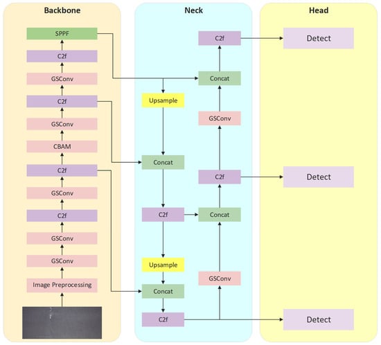 The YOLO-GCW model mainly consists of image preprocessing, backbone network, necking network, and head layer. First, to enhance the detection ability of defect information and enhance feature extraction efficiency, the input images would be preprocessed by Gaussian filtering, binarization, and gray scaling techniques.