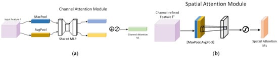 Figure 3b illustrates the structure of SAM. It takes the feature maps generated by the channel attention mechanism and applies channel-based maximum and average pooling to create two H × W × 1 feature maps, enabling multichannel information fusion. These maps are then concatenated and processed through a 7 × 7 convolution, with the output passed through a sigmoid function. Finally, the resulting features are multiplied by the input feature map to produce CBAM’s final output.