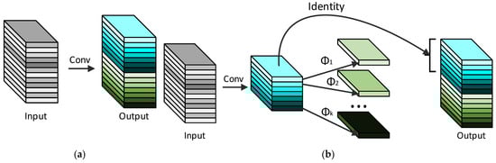 The Ghost module first convolves the input feature map; the number of output channels is half the normal convolution. Then, the linear transformation is performed on the feature maps obtained from each output channel separately. Finally, the results of the linear transformation are spliced with the previously arrived feature map. The calculation process is as follows: