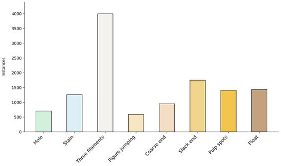The dataset analyzed during the current study is available in the Ali Tianchi cloth defect detection public dataset repository: https://tianchi.aliyun.com/dataset/79336 (accessed on 22 November 2024). In order to verify the performance of the improved algorithm in the field of textile defect detection, we screened the images from the dataset for eight types of defects: Hole, Stain, Three Filaments, Figure jumping, Coarse end, Stack end, Pulp spots, and Float, with a total of 2420 images.