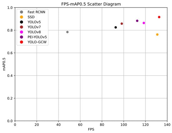 Figure 6 shows the scatter plots of FPS-mAP0.5 for each model, which can more intuitively see the differences between the models.