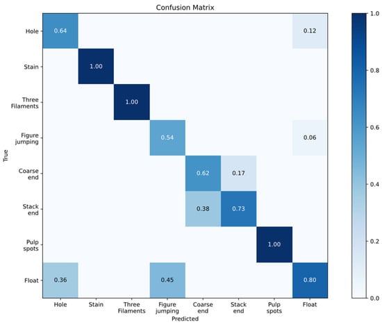 From Table 3, it can be seen that both SSD and Fast RCNN have different degrees of miss detection in the defect categories such as Stain, Three filaments, Coarse end, Slack end, Pulp spots, etc., but the YOLO series basically recognizes most of the defects, especially, the YOLO-GCW can recognize each type of defect with high accuracy. At the same time, we present the confusion matrix results of the dataset in Figure 7, where the x-axis represents the prediction result and the y-axis represents the real result, which can further verify the accuracy of the proposed method.