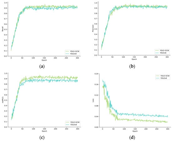 Moreover, the comparison of each training curve of the YOLO-GCW and the baseline model YOLOv8 in this paper is also shown in Figure 8. From this figure, it can be seen that the YOLO-GCW and YOLOv8 are basically the same in terms of precision, but the results of YOLO-GCW on recall, mAP0.5, and loss are significantly stronger than the YOLOv8 model, which verifies the validity of this model.