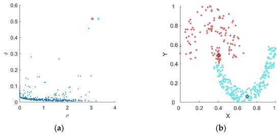 However, when there is a significant density difference between clusters, this cluster center selection mechanism is prone to errors. Taking the Jain dataset as an example, the optimal result of DPC on this dataset is shown in Figure 2. Figure 2a displays the corresponding decision graph, where two points in the upper-right corner clearly have an advantage in terms of density and neighbor distance. However, as shown in Figure 2b, both of these points belong to the high-density bottom cluster, while the sparse upper cluster fails to select any density peak as its center.