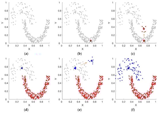 Clustering process (): (a) ground truth; (b) find the first local center (shaped as the red star); (c) add to the bottom cluster; (d) find the second local center (shaped as the blue star); (e) add to the top cluster; (f) final result.