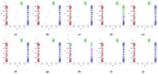 As an important branch of clustering algorithms, density clustering algorithms are methods that group data based on the density distribution of data points [8,9,10,11,12,13]. DBSCAN [8] and DPC [13] are two typical density-based clustering algorithms. DBSCAN does not require the pre-specification of the number of clusters and identifies core objects by filtering the number of neighbors contained within a given radius; then, it expands the cluster by continuously extending the reachable range of the core objects. DBSCAN can be used for clustering data of any shape; however, when there are significant differences in density within the dataset, it struggles to distinguish different clusters using the same radius. OPTICS [9] is an improved algorithm for DBSCAN that reduces the dependence on the parameter radius. By sorting the objects in the dataset, an ordered object list is obtained, which can assist in cluster detection using different parameters. However, the OPTICS algorithm cannot explicitly generate clustering results, and using the above object list to extract clusters is dependent on the user’s judgment.