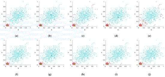 Then, all the points in the lower arc-shaped cluster have been marked as processed, and the point with the highest original local density is selected among the remaining points as the second local center (the blue star in Figure 4), denoted by here. As has not been processed, create a new cluster , add to , and mark it as processed. Similar to the first step, expansion is performed based on until cluster can no longer be extended (forming the upper blue cluster in Figure 4).