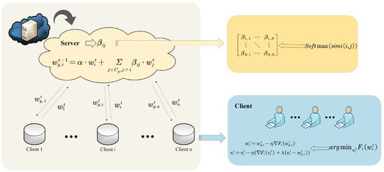 The overall process of FedDWA is shown in Figure 1. First, the server sends the exclusive global model to the corresponding client, which updates the local personalized model and the exclusive global model in turn. The training process of the personalized model takes the exclusive global model as a reference and dynamically adjusts the extent to which the personalized model refers to the exclusive global model through hyperparameters . Next, the client uploads the model updates corresponding to the updated exclusive global model to the server. The server calculates the cosine similarity between the model updates uploaded by the clients and computes the corresponding aggregation weights. Finally, the server aggregates the exclusive global model for each client.