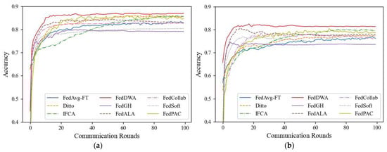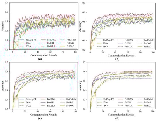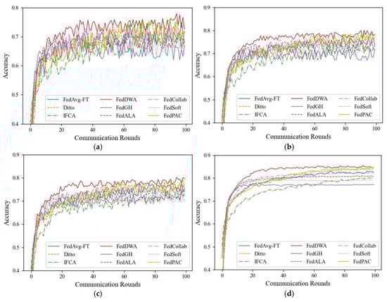The training curves of the average test accuracies for FedDWA and the other six personalization algorithms are shown in Figure A1, Figure A2 and Figure A3. It can be seen that the proposed algorithm achieves faster convergence and higher final accuracy, proving the effectiveness of the model. Additionally, the FedDWA algorithm exhibits smaller fluctuations and smoother changes during model updates, indicating higher stability. In contrast, the FedPAC algorithm fluctuates more during training due to its compression mechanism, which causes an inconsistent loss of information across different iterations, affecting model update stability. Other personalized algorithms show relatively stable convergence curves with smaller fluctuations. The curves in Figure A1, Figure A2 and Figure A3 clearly demonstrate the impact of different client participation rates on performance, with higher participation rates resulting in higher accuracy and faster convergence. Even with a decrease in client participation, the FedDWA algorithm maintains good accuracy and convergence across datasets, demonstrating its strong competitiveness.