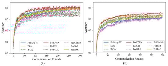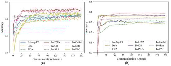 In all experiments, this paper used the SGD optimizer to train the models, and the loss functions are all cross-entropy loss functions. The number of local training rounds for all algorithms was uniformly set to 5, the learning rate was uniformly set to 0.01, the batch size was set to 16, the total number of clients was set to 20, and the participation rate was set to 1. In addition, we set the number of communication rounds to 100, 200, and 300 in the CIFAR-10, CIFAR-100, and Tiny-ImageNet datasets, respectively. In Ditto and FedDWA, the parameter was set to 1. When FedDWA performs model aggregation, the model aggregation weight was set to 0.2. In addition, the number of clusters was set to 4 in the experiments of the IFCA algorithm.