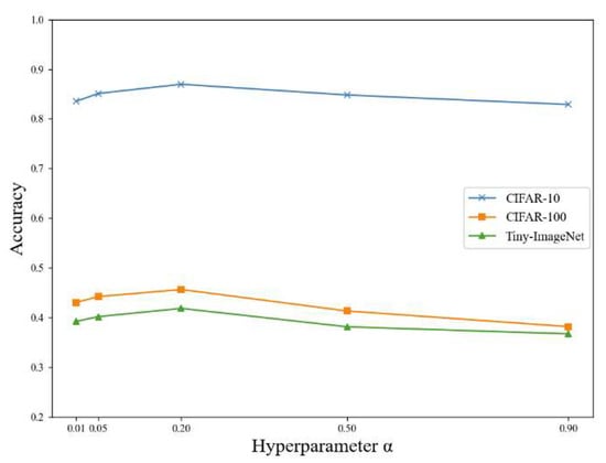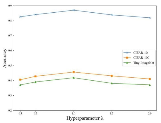 In the FedDWA algorithm, the hyperparameter is used to control the degree of dependence of the personalized model on the exclusive global model to better fit the client’s local data distribution. In the experiments, the initial setting is . To investigate the effect of on model performance, experiments were conducted on three datasets—CIFAR-10, CIFAR-100, and Tiny-ImageNet—using different values of : {0.3, 0.5, 1, 1.5, 2}.