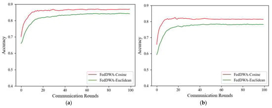 In this section, we compare the FedDWA algorithm using cosine similarity and Euclidean distance as model similarity metrics through experiments on the CIFAR-10 dataset and analyze their performance in average test accuracy to evaluate the effectiveness of these two metrics. The experimental results are shown in Figure 10. The experimental results show that the FedDWA algorithm using cosine similarity as the similarity metric performs better in accuracy, verifying the effectiveness of cosine similarity in measuring model similarity. This is because cosine similarity can more accurately reflect the similarity between client model updates by considering the directional differences between client model updates rather than relying solely on the absolute size of the distance. In contrast, the FedDWA algorithm using Euclidean distance is greatly affected by data heterogeneity, resulting in lower model accuracy. Therefore, this paper used cosine similarity to measure the similarity between model updates.
