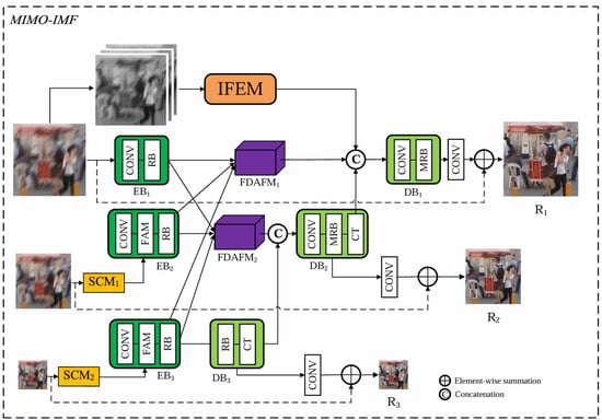 In addressing the challenges of localized dynamic blurring and low-light conditions in smart cabinets, it is important to recognize that these issues primarily stem from the limitations imposed by the frame rate of the camera hardware and the rapid removal of goods by consumers. To mitigate these challenges, this paper introduces a novel method termed MIMO-IMF, the structure of which is depicted in Figure 1. Building upon the MIMO-UNet architecture, we propose a frequency-domain attention-enhanced adaptive feature fusion module aimed at recovering dynamic blur in merchandise images. Additionally, we have designed a low-light brightness feature extraction module to enhance the performance of smart cabinets in low-light environments.