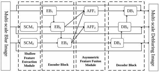MIMO-UNet, a multi-scale image blind deblurring model, the network architecture is divided into four main parts: shallow feature extraction module (SCM), encoder (EB), asymmetric feature fusion module (AFF), and decoder (DB). The structure is shown in Figure 2. Through the design of multi-scale feature inputs and outputs, the model is able to efficiently capture the feature information of the blurred region and recover it.