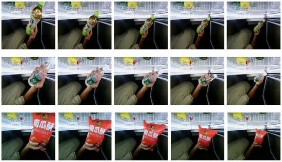 Here, x is a random trajectory vector generated by a Markov randomization process; denotes the image after motion blurring; represents the clear image; K is the blurring kernel; is the result of the computation of x using a sub-pixel interpolation algorithm. To adapt the dataset specifically for smart cabinet scenarios, we created a custom dataset consisting of 12 merchandise categories, each with 100 clear images acquired using an RGB camera mounted on the smart cabinet. We then applied the aforementioned algorithm to generate motion blur images, resulting in 1200 clear-blurred image pairs. These pairs were divided into (960) for the training set and (240) for the test set, ensuring no overlap between the two subsets. This dataset, named MBSI (Motion Blur Shop Images), is tailored for smart cabinet scenarios and is used to evaluate the applicability of our method in real-world environments. Examples of the dataset are shown in Figure 4.
