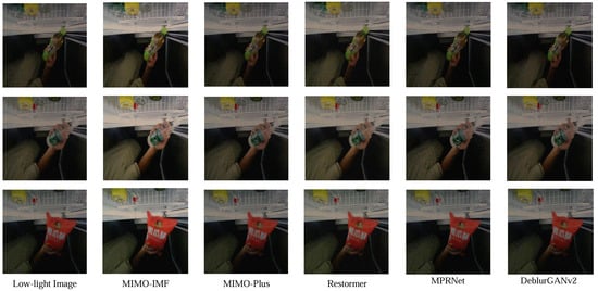 To rigorously assess the effectiveness of the proposed IFEM in handling low-light deblurring scenarios, we conducted extensive experiments using the MBSI dataset’s extended subset (low-light simulation). This extended subset was generated by simulating real-world low-light environments through targeted manipulations, including brightness reduction and noise injection, to emulate challenging lighting conditions encountered in smart cabinet applications.The experiments conducted in this study focus on addressing the challenges of image deblurring in low-light and normal lighting conditions encountered in smart cabinet applications. Comparative evaluations were carried out across three representative images using five different methods in Figure 5: MIMO-IMF (our proposed method), MIMO-Plus [9], Restormer [21], MPRNet [25], and DeblurGANv2 [19]. The experimental results reveal that the MIMO-IMF consistently outperforms competing methods, delivering superior image clarity under low-light conditions. The enhanced performance of our model is attributed to the unique design of the IFEM, which effectively extracts channel-specific luminance features and fuses them to generate an adaptive luminance attention map. This mechanism emphasizes critical luminance regions in the image, enabling better feature enhancement and integration in downstream processes. Consequently, the IFEM equips the MIMO-IMF with a distinctive advantage in recovering structural and visual details, ensuring higher accuracy in identifying merchandise under adverse lighting conditions, a challenge inadequately addressed by existing deblurring models.