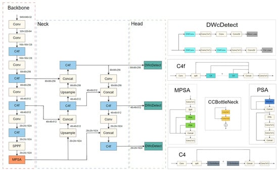 The YOLOFLY framework proposed in this paper aims to enhance the object detection performance of consumer-grade UAVs in complex environments. To achieve this, we have designed several innovative modules, including the C4f feature extraction module, the MPSA attention mechanism, the DWcDetect depthwise separable convolution detection head, and the ACIoU loss function. The overall network architecture is shown in Figure 1.