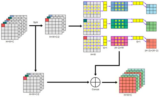 To avoid this issue, this paper proposes a new optimization direction for feature extraction—changing the convolutional form in the feature extraction process. Specifically, we introduce C4f, which, like C2f and C3k2, maintains a residual structure but uses spatially separable convolutions (m × 1, 1 × m) in place of traditional convolutions (m × m) in the bottleneck blocks. The feature extraction process of C4f is shown in Figure 2. The input feature map is first split into two parts via a split operation. One part undergoes spatially separable convolution to learn more refined features. The processed feature map is then concatenated with the other part, resulting in the final output feature map. This residual connection enables better gradient propagation during training, preventing vanishing gradients and thus improving the model’s performance.
