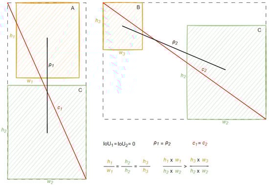 where and are the width and height of the predicted box B, and and are the width and height of the ground-truth box C.