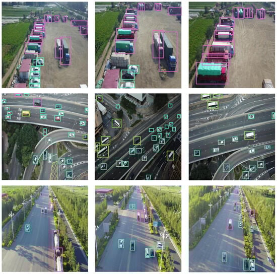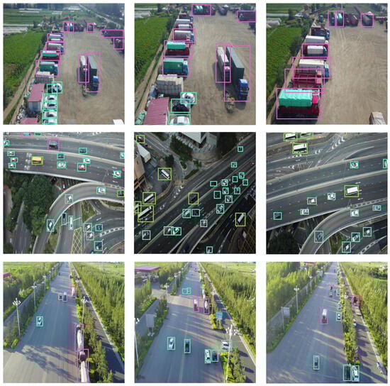 In terms of detection accuracy, heavyweight YOLO models, such as YOLOv8m, YOLOv9m, YOLOv10m, and YOLOv11m, generally outperformed other models. For example, YOLOv11m achieved an mAP50-95 of 28.06%, significantly higher than YOLOFLY’s 24.72%, showing the advantages of these models in fine-grained feature extraction. However, these models exhibited slower detection speeds, leading to poorer performance in terms of the missed detection rate. Specifically, YOLOv8m exhibited a missed detection rate for slow motion (MS) of 0.58% and a missed detection rate for fast motion (MF) of 27.26%, whereas YOLOv11m’s MS rate was 0.12%, but its MF rate was 14.07%. These data indicate that although heavyweight models provide higher detection accuracy in static scenes, their missed detection rate increases significantly when targets move quickly, especially in high-dynamic environments (such as UAV-captured scenes), leading to a substantial drop in detection performance. This is mainly due to the more complex structures of heavyweight models, which result in longer inference times and affect their responsiveness in fast-moving scenarios. The detection results of YOLOFLY on VisDrone are shown in Figure 6, whereas the detection results of YOLOv11n on VisDrone are shown in Figure 7.