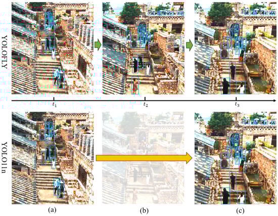 In addition, we performed a comparison of the real-time detection results between YOLOFLY and YOLOv11n, as shown in Figure 8. As can be seen, from time t1 to t2 and finally to t3, YOLOFLY completed detection on three video frames ((a), (b), and (c)), yielding a rich set of detection results. However, YOLOv11n only completed detection on frames (a) and (c), missing frame (b), which resulted in significant missed detections.