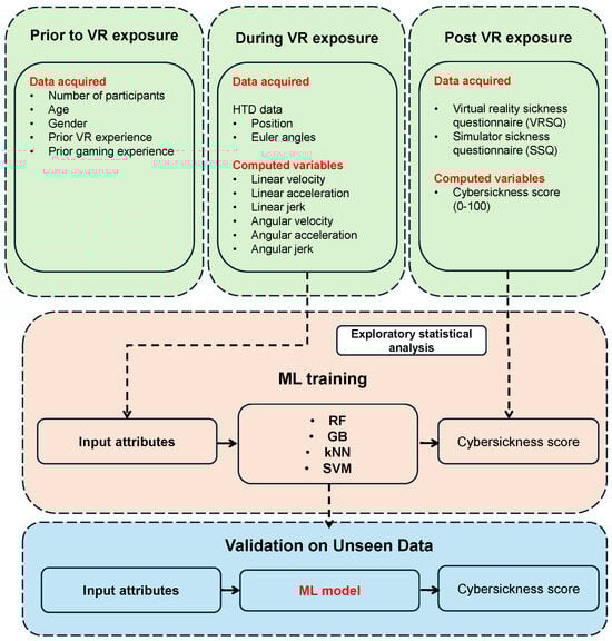 Workflow diagram illustrating the methodology used in the present study. Data acquisition included HTD (head-tracking device) data, virtual reality sickness questionnaires (VRSQ and SSQ), and demographic attributes (e.g., number of participants, age, gender, and prior VR and gaming experience). Computed variables encompassed measures such as linear and angular velocities, accelerations, and jerks, alongside cybersickness scores. These inputs underwent exploratory statistical analysis and machine learning (ML) model training (RF, GB, kNN, SVM) followed by validation on unseen data to assess predictive performance.