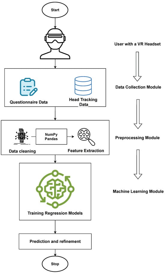 The implementation methodology employs a systematic approach to develop, train, and evaluate machine learning algorithms for predicting user sickness based on features derived from virtual reality (VR) data. The pipeline begins by extracting and preprocessing data from multiple CSV files extracted from each user, containing user head-tracking data and the computed variables. The data are consolidated with associated sickness scores provided in a separate file, enabling supervised learning. The input features include both linear and angular measurements such as velocity, acceleration, jerk, and rotation components, alongside environmental parameters like frame rate and time intervals. These features are scaled using tthe StandardScaler module from the scikit-learn library [], ensuring comparability across different magnitudes and preventing feature dominance due to different scales. Four machine learning models are employed, including Random Forest Regressor, Gradient Boosting Regressor, Support Vector Regressor (SVR) and K-Nearest Neighbors (KNN). Each algorithm brings unique strengths: Random Forest and Gradient Boosting leverage ensemble learning to capture complex relationships [,], SVR provides robust handling of non-linear boundaries, and KNN is intuitive and effective for local patterns [,,]. Hyperparameter tuning is conducted for all models using a grid search strategy combined with cross-validation to optimize performance, using the GridSearchCV module in the sklearn library [].