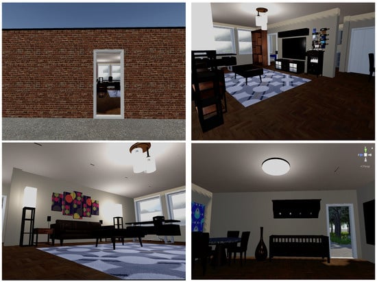 Figure 3 provides representative snapshots of the developed VR scene, illustrating its spatial configuration, lighting conditions, and interactive elements. Interaction in the scene was implemented through XR interaction setups, such as teleport anchors, which allowed participants to navigate the environment comfortably and minimized the risk of simulator sickness.