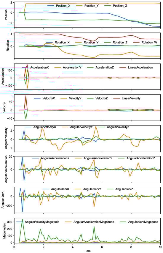 Example of the temporal evolution of motion metrics: position, rotation, velocity, acceleration, angular velocity, angular acceleration, angular jerk, and Magnitudes are plotted to illustrate dynamic trends over time.