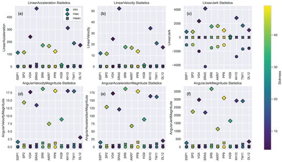 Scatter plots showing the minimum, maximum, and mean values of motion features across multiple datasets. Each subplot represents one of six features: (a) linear acceleration, (b) linear velocity, (c) Linear Jerk, (d) angular velocity magnitude, (e) angular acceleration magnitude, and (f) angular jerk magnitude. The X-axis shows the user, and the Y-axis shows the feature values. Markers indicate the min (circles), max (diamonds), and mean (crosses) values for each feature. The color of the markers represents the corresponding sickness score, visualized using a continuous color scale. This figure highlights the distribution of statistical measures for each feature across datasets and their potential relationship to user sickness.