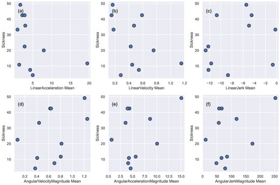 Scatter plots showing the relationship between mean values of motion features and sickness scores. Each subplot represents one of six features: (a) linear acceleration, (b) linear velocity, (c) Linear Jerk, (d) angular velocity magnitude, (e) angular acceleration magnitude, and (f) angular jerk magnitude. The X-axis shows the mean value of each feature, while the y-axis shows sickness scores. Each point represents data from an individual dataset, highlighting potential correlations between peak motion dynamics and user discomfort.