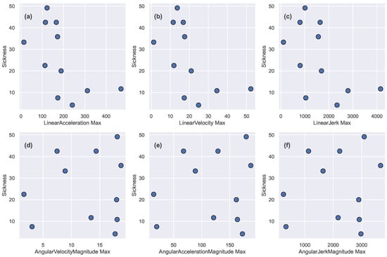 Scatter plots showing the relationship between maximum values of motion features and sickness scores. Each subplot represents one of six features: (a) linear acceleration, (b) linear velocity, (c) Linear Jerk, (d) angular velocity magnitude, (e) angular acceleration magnitude, and (f) angular jerk magnitude. The X-axis shows the maximum value of each feature, while the Y-axis shows sickness scores. Each point represents data from an individual dataset, highlighting potential correlations between peak motion dynamics and user discomfort.