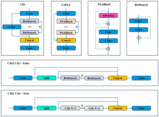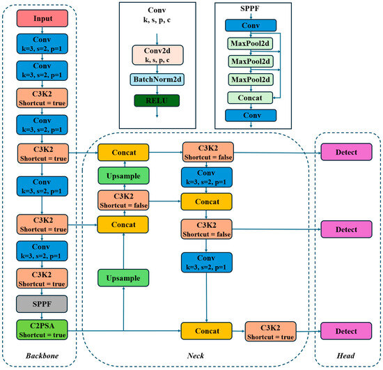 As shown in Figure 2, YOLOv11 is an improvement upon the YOLOv8 network, continuing the classic structure of the YOLO series. This architecture modifies the backbone by adjusting the Bottleneck module with the C3K2 module. After the SPPF module, a C2PSA module is added. Techniques such as deep residual convolutions and normalization are employed to extract effective features and reduce the image dimensions. Next, the extracted features are passed to the Neck. From the perspective of feature fusion, a Path Aggregation Network–Feature Pyramid Network (PAN-FPN) structure is used to complete multi-scale feature engineering, producing feature maps at large, medium, and small scales. Finally, the fused features are sent to the detection head, where a Decoupled Head performs high-precision classification and bounding box regression tasks, ultimately outputting the detection results.
