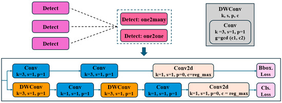 The Decoupled Head [33] mechanism in the Head is illustrated in Figure 4. Firstly, the structure has two parallel branches: one extracts class features and the other extracts location features. Each branch uses a 1 × 1 convolution layer to complete the classification and localization tasks. This decoupling allows the classification task to focus more on the central region of the object, while the bounding box regression focuses on the edge information, effectively improving detection accuracy. Next, two depthwise convolutions (DWConv) are inserted into the classification detection head to focus on convolution operations in spatial dimensions. To address the lack of cross-channel information integration in DWConv, a 1 × 1 convolution is used to combine cross-channel information, forming Depthwise Separable Convolution (DSC) [34]. This combination maintains network performance while significantly improving computational efficiency, greatly reducing both model complexity and parameter count.