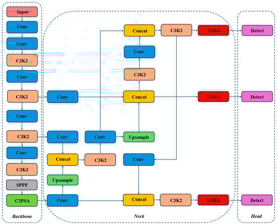 To further enhance the multi-scale feature extraction capability of YOLOv11-n, this paper introduces the LSKA mechanism. LSKA is an attention mechanism based on large-kernel separable convolutions, which decomposes large-kernel convolutions to capture long-range dependencies and adaptivity, while also decomposing the resulting 2D convolution kernels into a series of 1D convolutions [27]. This reduces computational complexity and memory requirements. Through large kernel convolutions and attention mechanisms, the LSKA module can model global context information more effectively, improving the model’s ability to capture spatial relationships and semantic information of objects. It enables richer feature representations at different scales and enhances the model’s adaptability to targets of various sizes. By incorporating LSKA before the Detect layer, the model can focus attention on the most critical features before making the final predictions, which helps improve the detection accuracy. The LSKA module includes depthwise convolution (DW-Conv), Depthwise Dilated Convolution (DW-D-Conv), and 1 × 1 Convolution (Conv). The principle and structure of the LSKA module are illustrated in Figure 6.