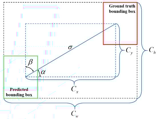 In the equation, “”, “”, “”, and “” represent the width and height of the predicted and ground truth boxes, ““, “”, and “” represent the width and height of the overlap region between the two boxes and the total area of the two boxes, and and represent the distance between the centers of the predicted and ground truth boxes and the diagonal length of the smallest enclosing rectangle that covers both boxes.