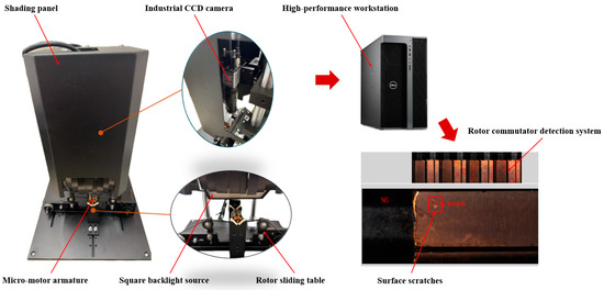 In contrast to conventional detection datasets, commutator defect detection faces challenges such as small size, reflective copper surfaces, and low contrast in defect areas. To address this, we have created a custom defect dataset for micro-motor commutators and developed a specialized defect detection platform to collect image data, as shown in Figure 8.