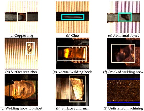 The micro-motor commutator defect dataset contains more than 16,000 manually annotated bounding boxes. The dataset includes nine types of defect images: copper slag, glue, abnormal object, surface scratches, normal welding hook, crooked welding hook, welding hook too short, surface abnormal, and unfinished machining (as shown in Figure 9). The dataset is divided into a training set (4160 samples), a validation set (520 samples), and a test set (520 samples). Considering that each sample image contains targets at multiple scales and with a certain level of density, the sample size is normalized to 640 × 640 pixels. This size setting has the following advantages: First, it ensures the imaging quality of the original image, laying a solid foundation for the feature extraction process while preserving useful information with minimal loss. Second, it meets the real-time detection requirements of the model, enabling the model to be effectively deployed on edge devices for practical implementation.