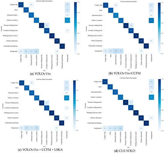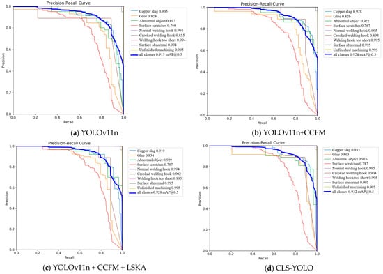 Second, after incorporating the CCFM module, LSKA module, and SIoU Loss, the model’s performance is enhanced in multiple areas, including feature fusion, feature extraction, and aspects such as the position of the bounding box center, aspect ratio, and angle. This improvement is reflected in the performance of each individual category metric. In most cases, each time a new structure is added, the P, R, and AP metrics show a certain degree of improvement. The optimal metrics are generally obtained from models that improved the Neck structure or both the Neck and loss function, with the latter showing the best overall performance. In some categories, the metrics after the addition of improvement modules show a decline compared to previous results. For example, in the abnormal object and welding hook too short categories, the best P value is achieved by YOLOv11n + CCFM. This is because the added improvement modules may not be the most optimal for certain categories. For instance, the SIoU Loss, after improving feature engineering, addresses issues such as free variation of the aspect ratios of bounding boxes and the misalignment between the true and predicted boxes, leading to improvements in categories such as copper slag, glue, normal needle, and crooked welding hook.