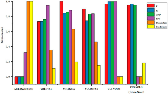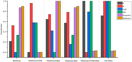 These three components complement each other, collectively enhancing the model’s detection accuracy and speed. To scientifically illustrate the process, the performance of four models—YOLOv11n, YOLOv11n + CCFM, YOLOv11n + CCFM + LSKA, and CLS-YOLO—are presented. The models are evaluated across seven dimensions widely used in the field of object detection: Precision (P), Recall (R), Average Precision (AP), Mean Average Precision (mAP), FPS, the number of parameters, and model size. The detailed results for each category on the test set are shown in Table 2 and Figure 11.