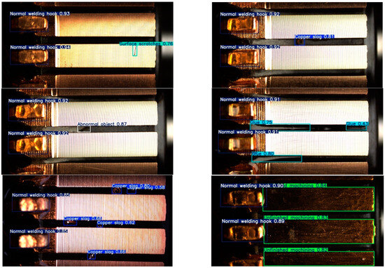 Overall, the successive improvements in the model architecture have resulted in optimal performance across five metrics in the micro-motor commutator defect detection dataset. The proposed model shows a 2.08% improvement in mAP@0.5 compared to the baseline network, and an 8.34% increase in FPS. This demonstrates that the model has successfully enhanced detection speed and optimized real-time performance while maintaining superior accuracy compared to the initial model. Additionally, the proposed model has only 1.860 million parameters and a model size of 3.79 MB, indicating that the CLS-YOLO model is capable of being deployed on most edge devices with relatively good versatility. The detection performance of the model on certain samples is shown in Figure 14.