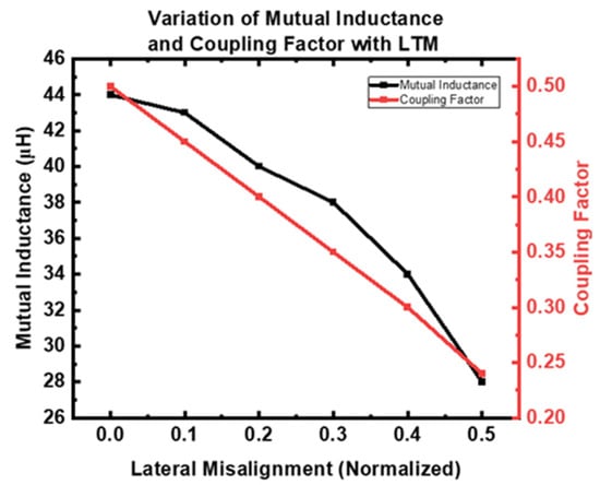 ), will change significantly if the secondary coil of the user EV cannot effectively follow the charger EV. The value of M is influenced by lateral misalignment (LTM), longitudinal misalignment (LNM), angular misalignment (AM), and vertical misalignment (VM). Among these four types of misalignments, LNM, VM, and AM have minimal impact on M for an EV. In contrast, LTM primarily causes the loss of transferred power. As LTM increases, the coupling factor between the coils decreases, leading to a reduction in mutual impedance, as illustrated in
