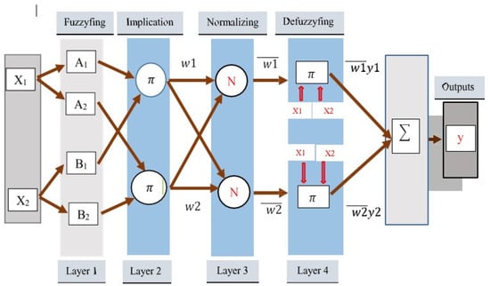 The fundamental ANFIS rule, that processes two inputs, X1 and X2, to generate a single output, y, is described as follows: