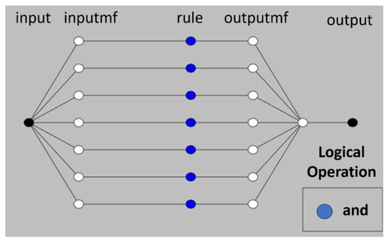 Figure 6 presents a schematic diagram of the ANFIS architecture, demonstrating how the system effectively combines the learning capabilities of a neural network with the fuzzy logic system to model the output–input relationships of real-world systems.